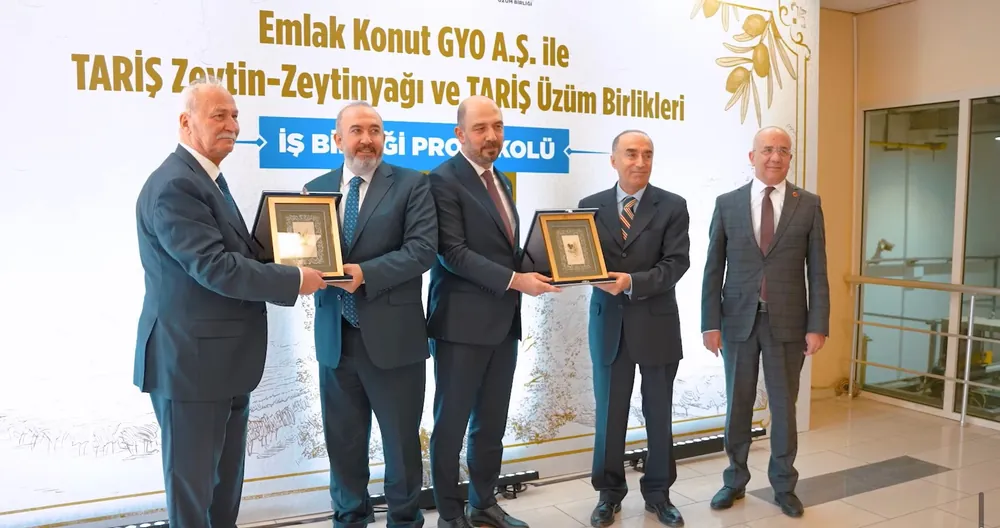 Yeni iş birliği protokolü kapsamında düzenlenen imza törenine, Emlak Konut GYO Yönetim Kurulu Başkanı Ertan Keleş, Genel Müdürü Yasir Yılmaz, Tariş Zeytin ve Zeytinyağı Birliği Yönetim Kurulu Başkanı Fikret Akova, Tariş Üzüm Birliği Yönetim Kurulu Başkanı Ferhat Şen katıldı.