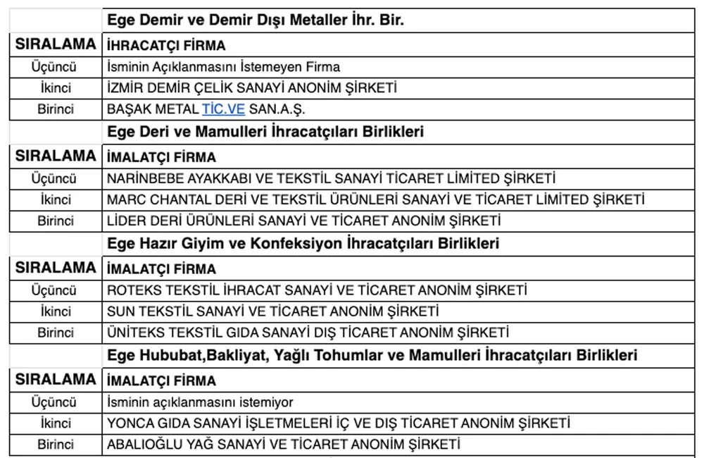 Ege Demir ve Demir Dışı Metaller İhracatçıları Birliği'nin ihracat şampiyonu Başak Metal olurken, Ege Deri ve Deri Mamulleri İhracatçıları Birliği'nde birinci Lider Deri firması oldu. Ege Hazır Giyim ve Konfeksiyon İhracatçıları Birlikleri'nde Üniteks Tekstil, Ege Hububat,Bakliyat, Yağlı Tohumlar ve Mamulleri İhracatçıları Birlikleri'nde Abalıoğlu Yağ firmaları birinci oldu.