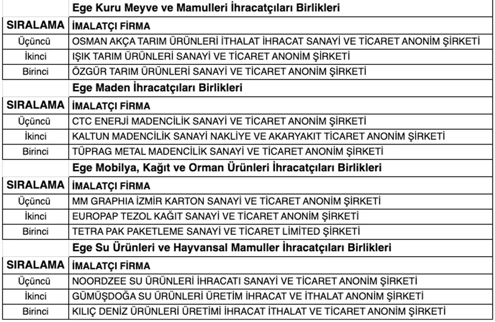 Ege Kuru Meyve ve Mamulleri İhracatçıları Birlikleri'nde Özgür Tarım Ürünleri, Ege Maden İhracatçıları Birlikleri'nde Tüprag Metal ihracatın birincisi oldu.