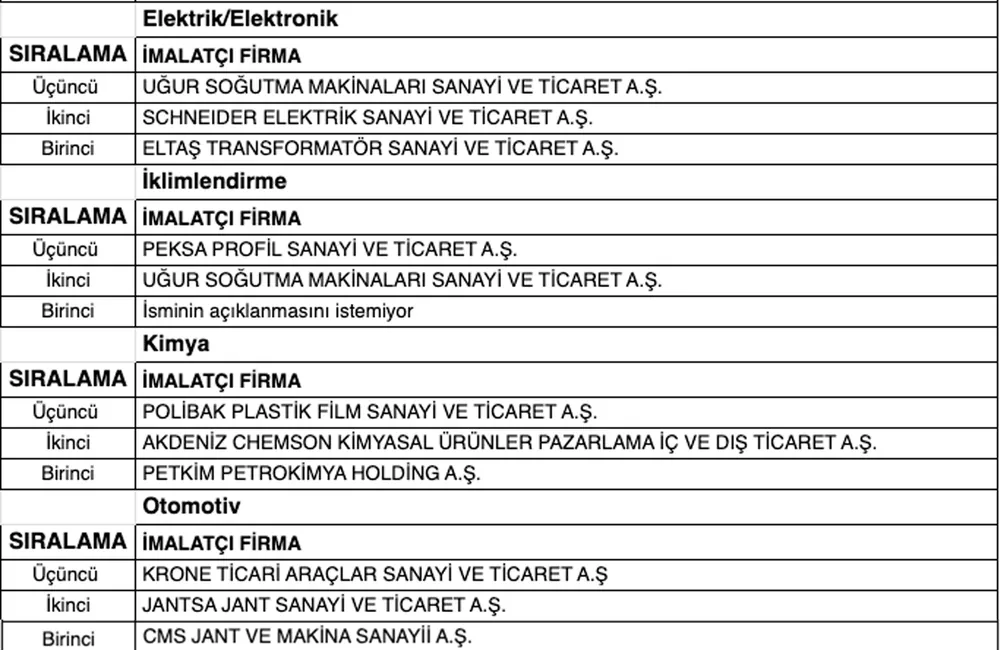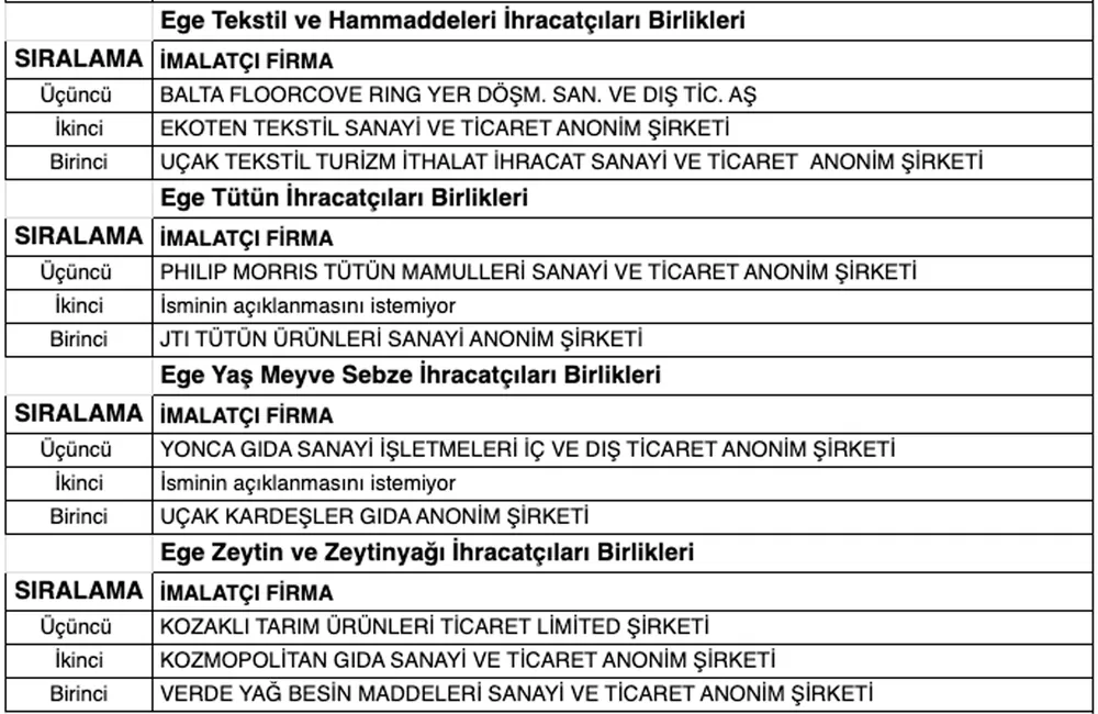 Ege Yaş Meyve Sebze İhracatçıları Birlikleri'nde Uçak Kardeşler, Ege Zeytin ve Zeytinyağı İhracatçıları Birlikleri'nde Verde Yağ birinci oldu.Elekrik-elekronikte Eltaş Transformatör, kimyada Petkim Petrokimya, otomotivdeki CMS Jant birinci oldu.
