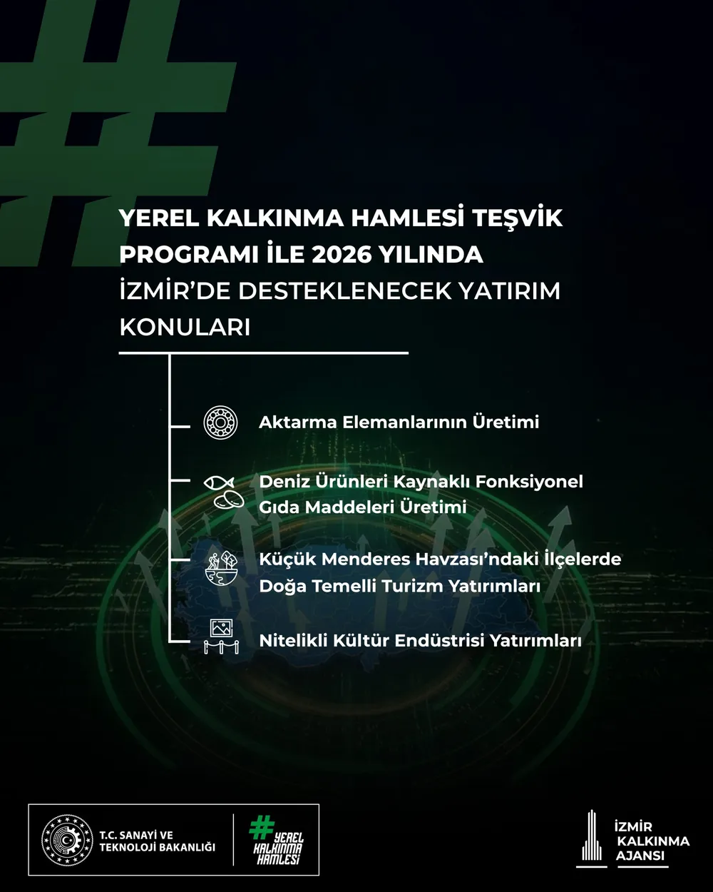 İzmir Kalkınma Ajansı tarafından bugün yapılan çağrı ilanında, 2026 yılında İzmir’de Aktarma Elemanlarının Üretimi (rulman, dişli/dişli takımı, mil, kaplin vb.), Deniz Ürünleri Kaynaklı Fonksiyonel Gıda Maddeleri Üretimi (balık/deniz protein hidrolizatları (FPH), kolajen / jelatin, Omega-3 konsantreleri, mineral ve kalsiyum ürünleri vb.), Küçük Menderes Havzası’ndaki İlçelerde Doğa Temelli Turizm Yatırımları (ekoturizm merkezi, agroturizm merkezi, yaşlı bakım merkezi vb.) ve Nitelikli Kültür Endüstrisi Yatırımları (müze, sanat galerisi, sahne sanatları gösteri merkezi, multidisipliner kültür/etkinlik kompleksleri, yaratıcı endüstri merkezleri, tasarım kampüsleri, zanaat ve dijital tasarım birleşimli merkezler vb.) desteklenecek yatırım konuları olduğu açıklandı.