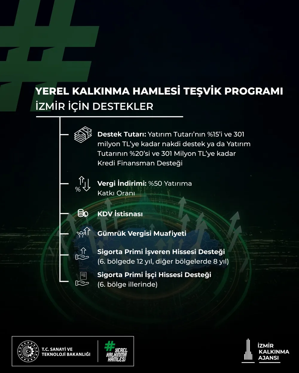 İzmir’de dört alanda yapılacak yatırımlara, yatırım tutarının yüzde 15’i ve 301 milyon TL’ye kadar nakit destek veya yatırım tutarının yüzde 20’si ve 301 milyon TL’ye  kadar kredi finans desteği sunulacak. Vergi indirimi, KDV istisnası, yatırım yeri tahsisi, gümrük  vergisi ve muafiyeti ile sigorta primi işveren ve işçi desteği verilecek.